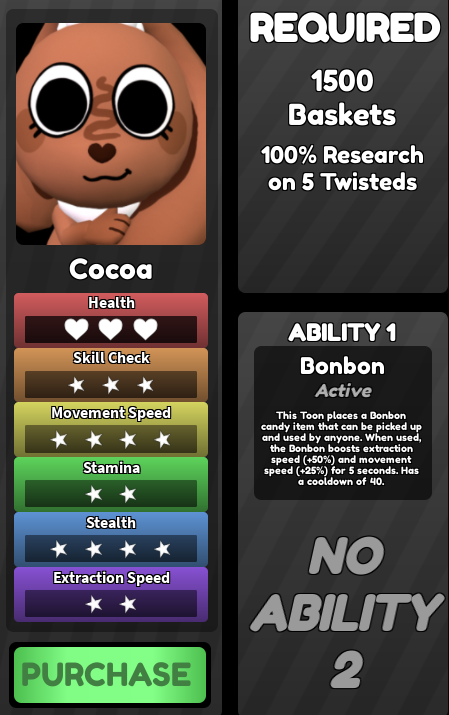This Toon places a Bonbon candy item that can be picked up and used by anyone. When used, the Bonbon boosts extraction speed (+50%) and movement speed (+25%) for 5 seconds. Has a cooldown of 40.